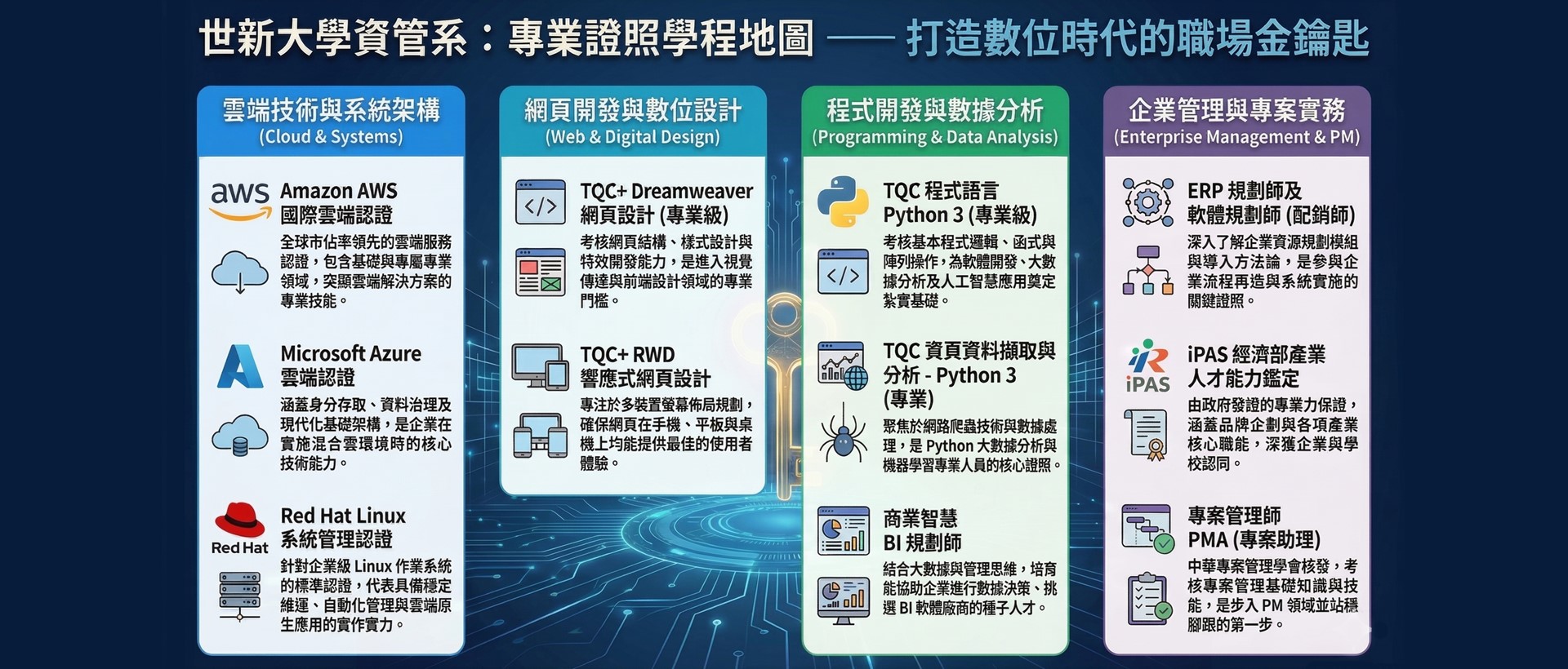 入學學年度 組別 115學年度 智慧商務暨數據傳播組 人工智慧暨科技傳播組 114學年度 資訊管理組 人工智慧暨科技傳播組 113學年度 資訊管理組 資訊科技組 智慧網路應用組 112學年度 資訊管理組 資訊科技 […]