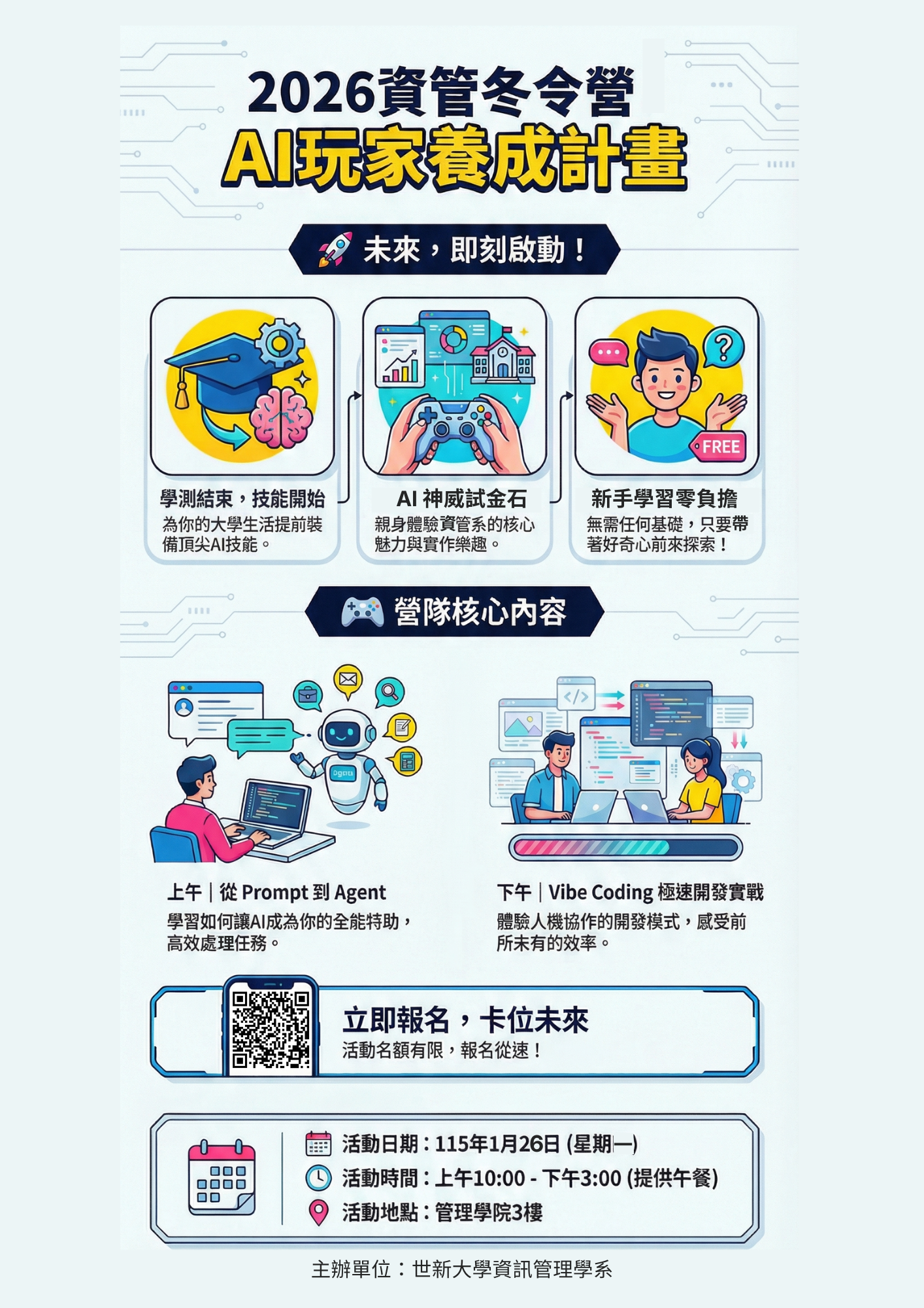 本系舉辦2026高中冬令營隊「🎮 AI 玩家養成計畫| 氛圍協作開發體驗營」