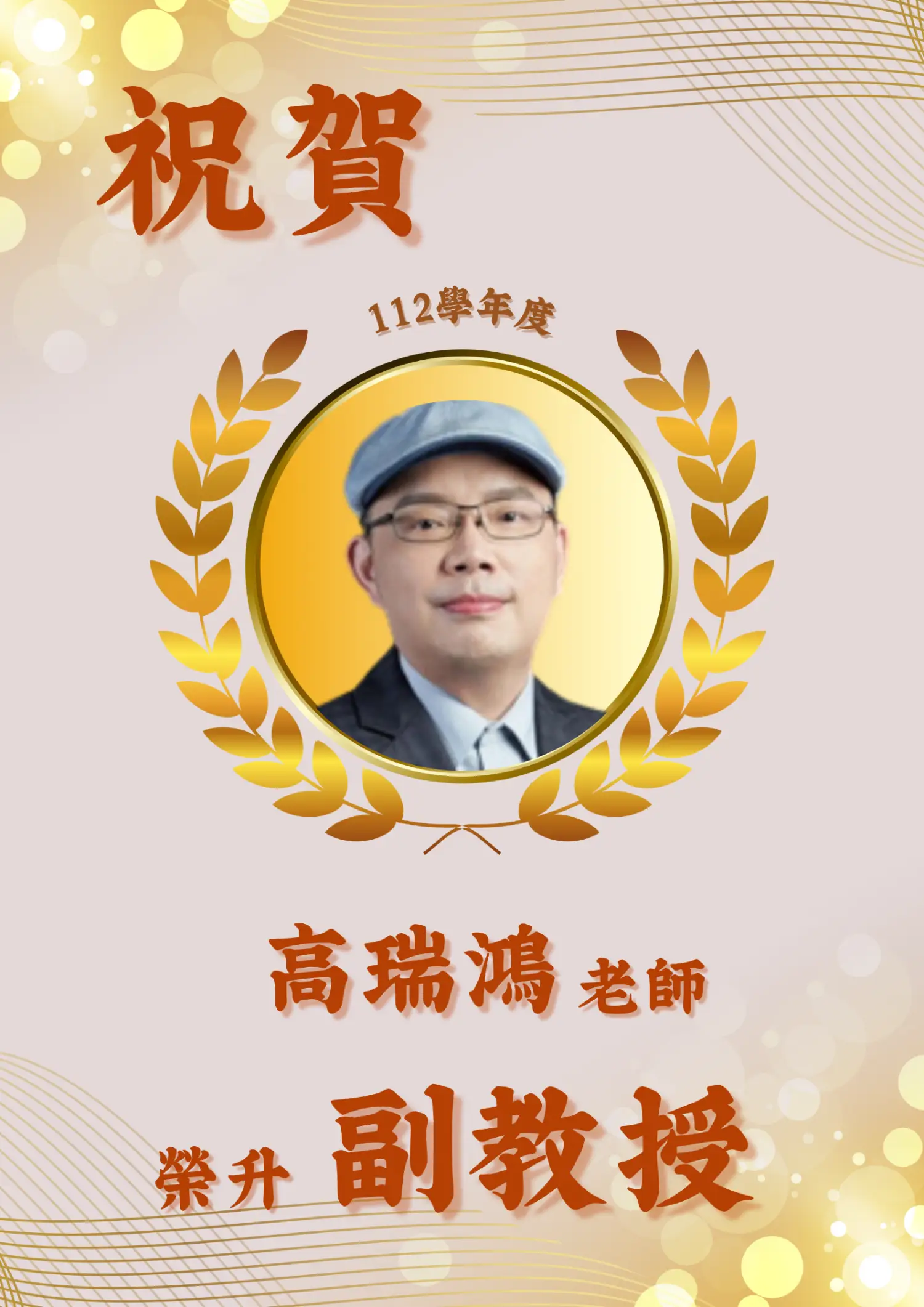 【恭賀】高瑞鴻老師榮升副教授 2023-12-22 賀 高瑞鴻老師榮升副教授 高瑞鴻老師在教學、研究及系務發展上表現優異,經學校評定成功榮升副教授,為本系及學校增添榮耀。感謝高老師多年來對學術與學生培育的投入,祝福未來教學與研究更上一層樓。