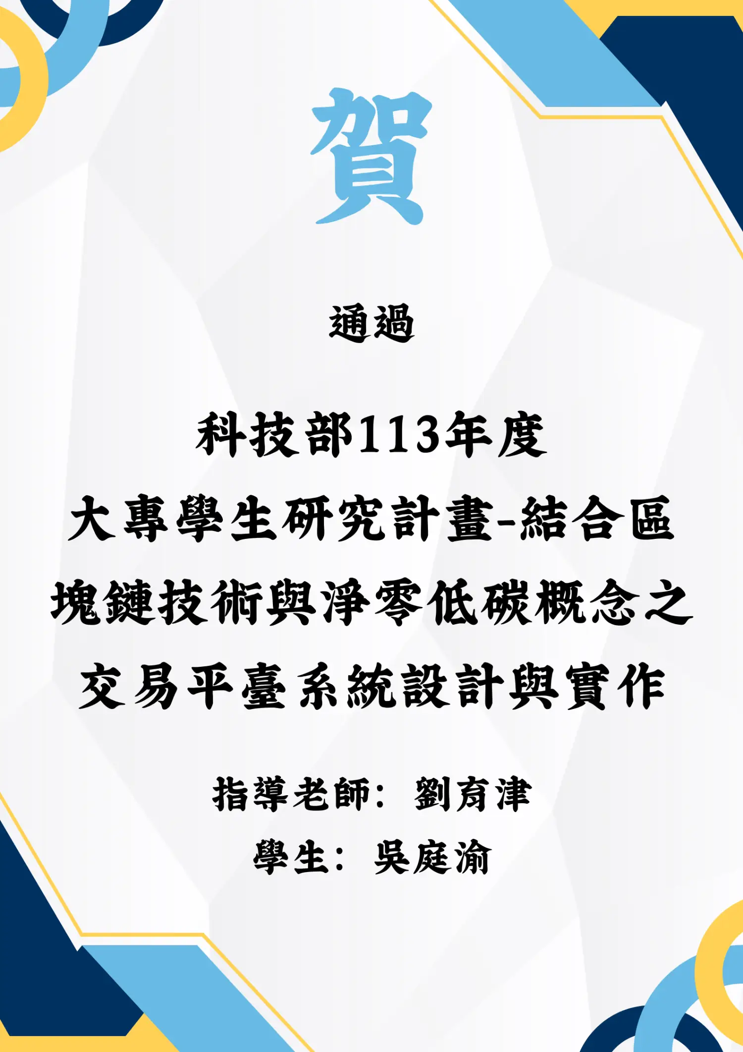 由 劉育津 老師 指導、 吳庭渝 同學 主持執行的計畫「結合區塊鏈技術與淨零低碳概念之交易平臺系統設計與實作」,成功通過科技部嚴格審查!