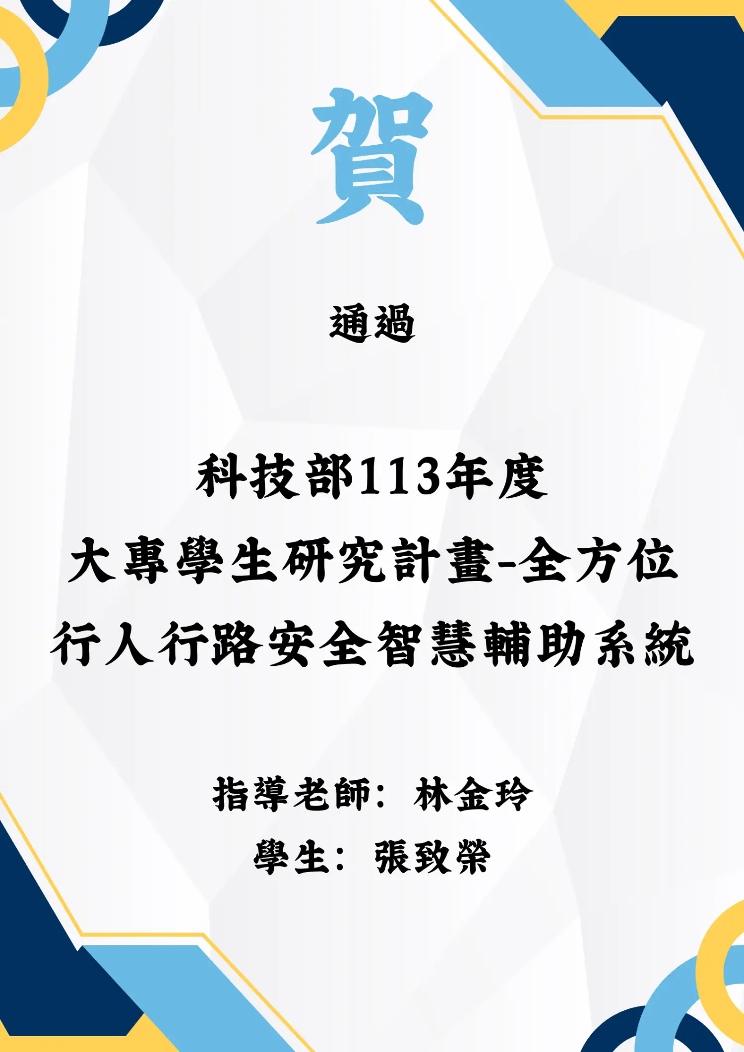 【賀】通過科技部113年度大專學生研究計畫 「全方位行人行路安全智慧輔助系統」 2024-11-30 賀 本系師生通過科技部113年度大專學生研究計畫!由林金玲老師指導、張致榮同學主持執行的計畫「全方位行人行路安全智慧輔助系統」成功通過科技部審查。本研究結合智慧科技與安全輔助設計,打造具前瞻性與實用性的行人安全輔助系統。再次恭喜團隊努力成果豐碩,感謝大家支持。指導老師:林金玲 研究學生:張致榮