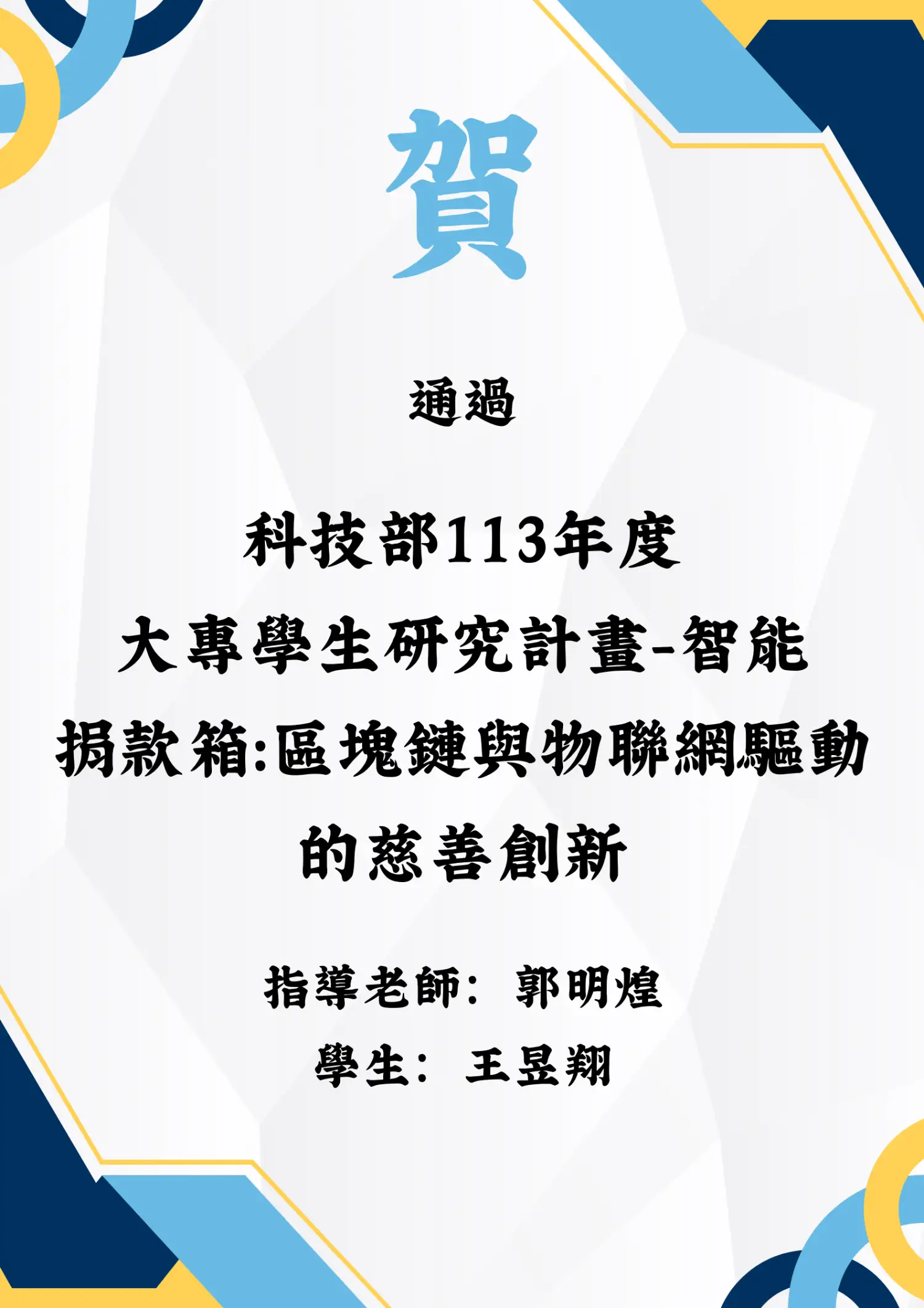 【賀】通過科技部113年度大專學生研究計畫 「智能捐款箱:區塊鏈與物聯網驅動的慈善創新」