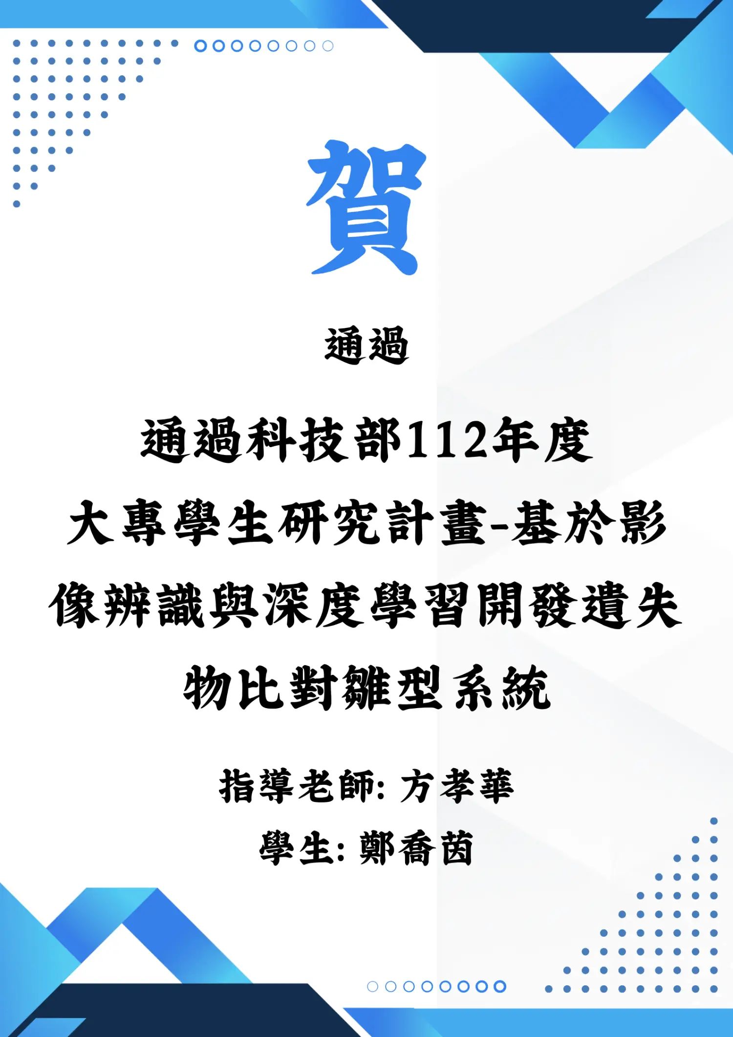 本系師生團隊榮獲科技部112年度大專學生研究計畫審查通過。本研究計畫由指導老師方孝華指導,學生鄭喬茵主持執行。本計畫旨在運用影像辨識與深度學習技術,建置一套可快速比對及辨識遺失物的雛型系統,以提升失物找回效率與準確性。感謝師生共同努力與系上支持,期盼本研究成果能為智慧辨識與社會服務應用帶來正向貢獻。指導老師:方孝華 研究學生:鄭喬茵